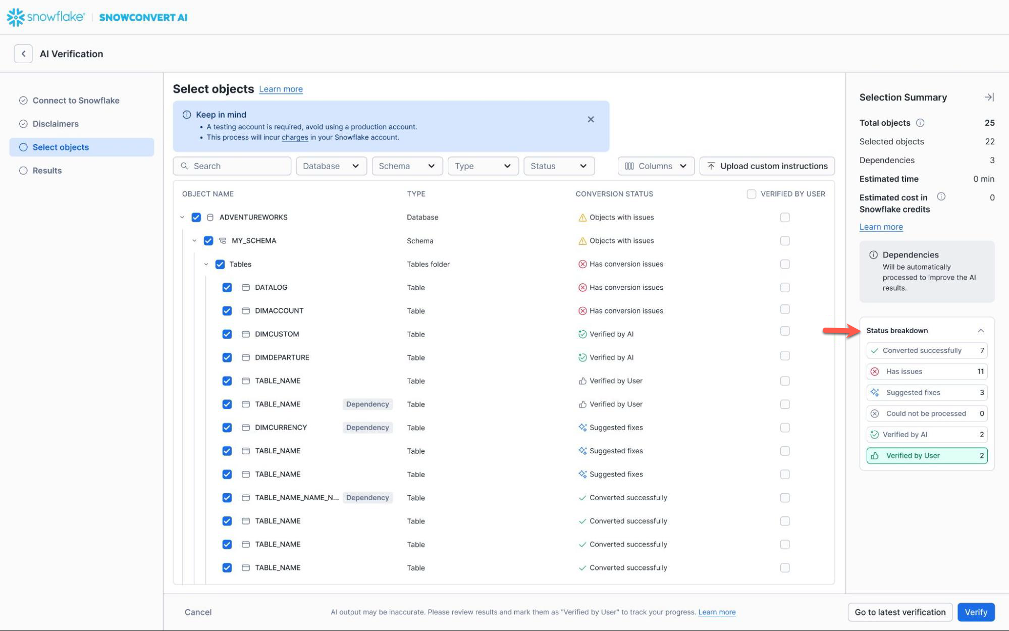 Mark objects as Verified by user to exclude them from subsequent runs of the AI code conversion process. This status indicates that the user has reviewed the code and considers it valid for deployment. It represents the highest level of trust.