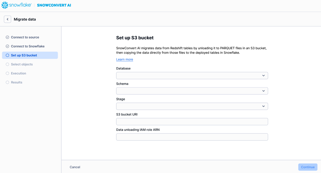 SnowConvert AI migriert Daten aus Redshift-Tabellen, indem sie in PARQUET-Dateien in einem S3-Bucket entladen werden. Dann werden die Daten direkt aus diesen Dateien in die bereitgestellten Tabellen in Snowflake kopiert.