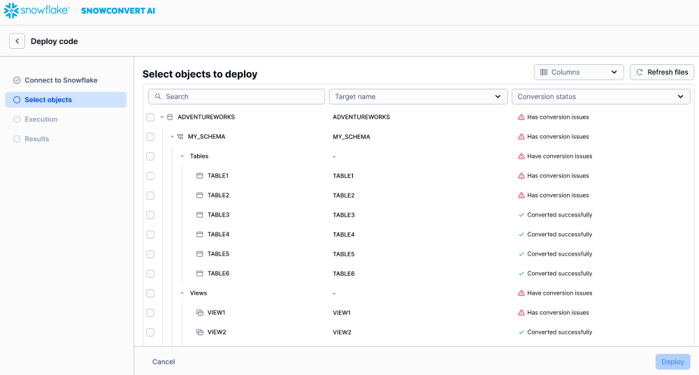 Select the objects that you want to deploy to Snowflake.