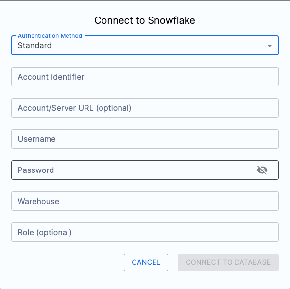 Authenticate to Snowflake by selecting either SSO or Standard authentication method and providing the required credentials according to your organization’s setup.