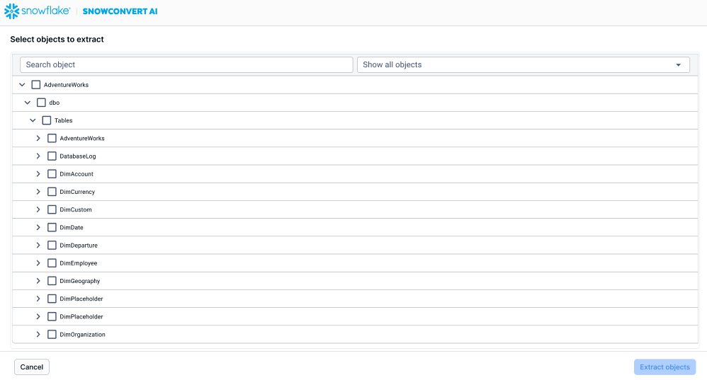 SnowConvert AI, as part of the end-to-end migration experience, offers the option to extract database objects from your source system to prepare them for the conversion process. This extraction feature is available for SQL Server and Amazon Redshift databases, letting you connect to your source database, browse the catalog, and select specific objects for migration.