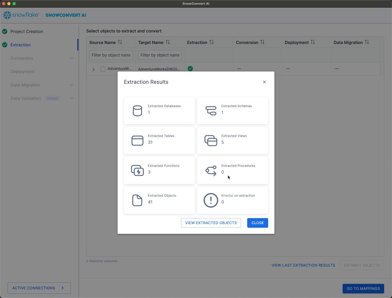 After completing the extraction process, you can proceed to the conversion process to transform your database objects for Snowflake compatibility.