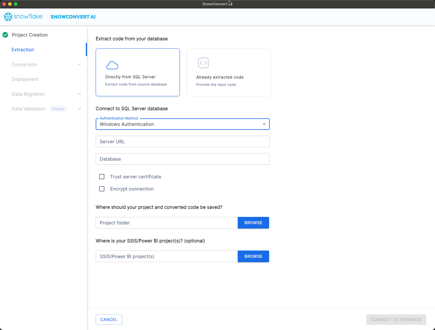 SnowConvert AI, as part of the end-to-end migration experience, offers the option to extract database objects from your source system to prepare them for the conversion process. This extraction feature is available for SQL Server and Amazon Redshift databases, allowing you to connect to your source database, browse the catalog, and select specific objects for migration.