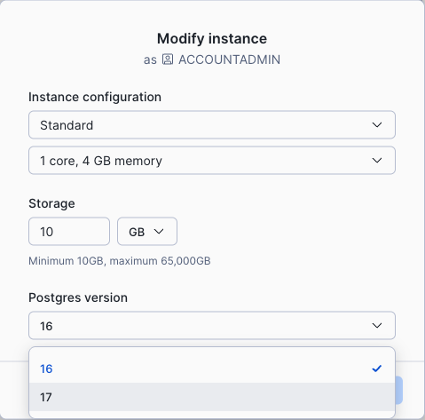 Snowflake Postgres ermöglicht es Ihnen, Ihre Hauptversions-Upgrades über das Dashboard zu planen. Um diese Änderung vorzunehmen, verwenden Sie den gleichen Prozess wie bei der Größenänderung einer Instanz. Das Aktualisieren Ihrer Instanz auf eine neue Hauptversion erfordert Wartung. Allgemeine Informationen zur Wartung finden Sie unter Wartung von Snowflake Postgres. Weiter unten finden Sie spezifischere Informationen zu Upgrades der Hauptversion.