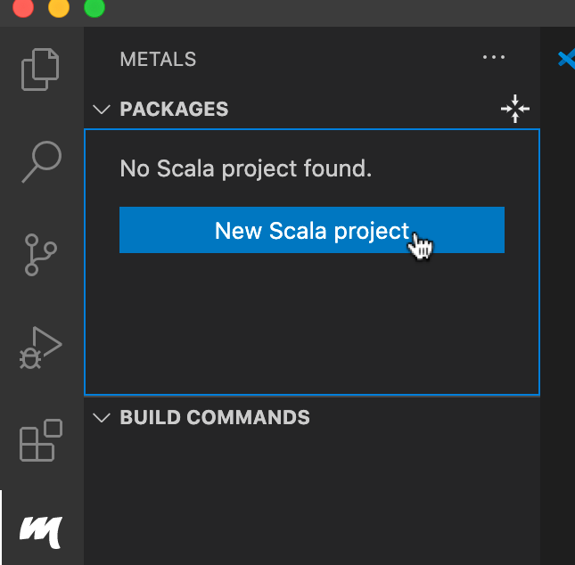 Under Packages in the Side Bar (to the right of the Activity Bar), click the New Scala Project button.