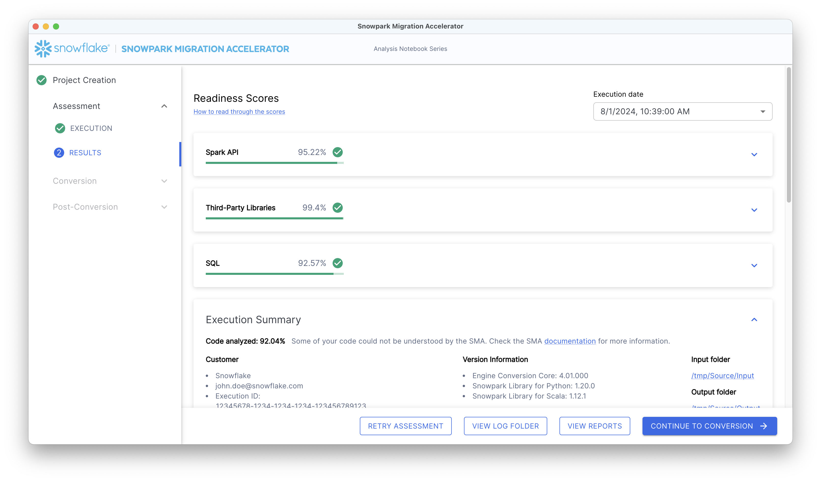 The results screen provides detailed information to help you understand your current code and its potential migration to Snowpark. For a complete walkthrough of this output, please refer to the Understanding the Assessment Summary section.