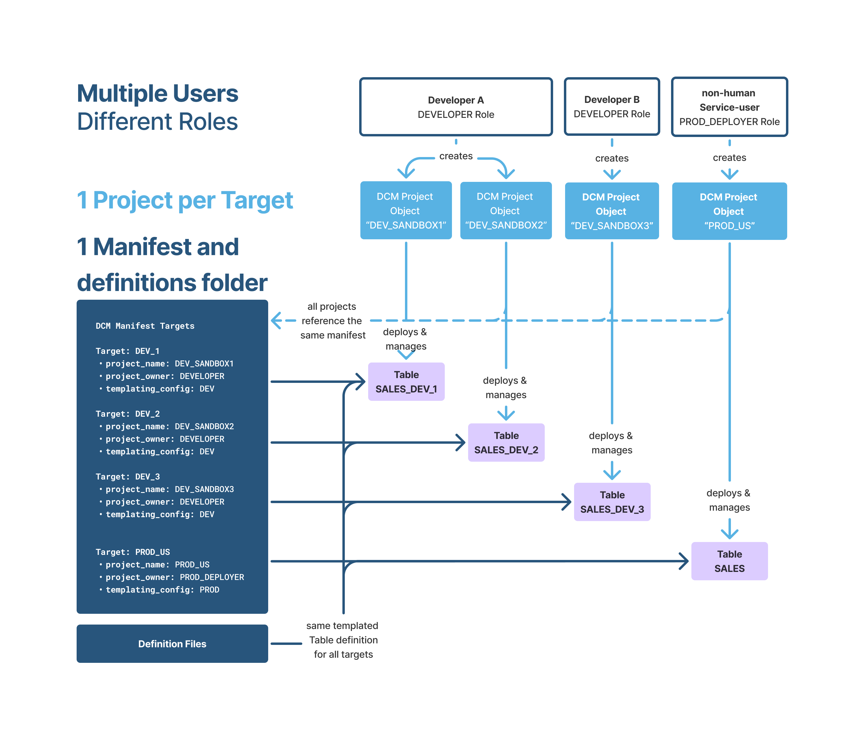 Les fichiers de définition DCM Projects ne sont pas strictement liés à un objet DCM project spécifique. Vous pouvez utiliser le même ensemble de définitions pour effectuer un déploiement sur plusieurs projets, soit sur différents comptes Snowflake, soit en référençant différents profils de configuration. Par exemple, les mêmes fichiers de définition sur une branche du référentiel peuvent être déployés à la fois sur les comptes DEV et PROD comme indiqué dans la figure suivante.