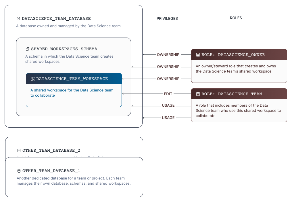 Les espaces de travail partagés sont créés sous forme d’objets de niveau schéma dans une base de données standard et suivent le modèle de contrôle d’accès basé sur les rôles existant de Snowflake (RBAC).