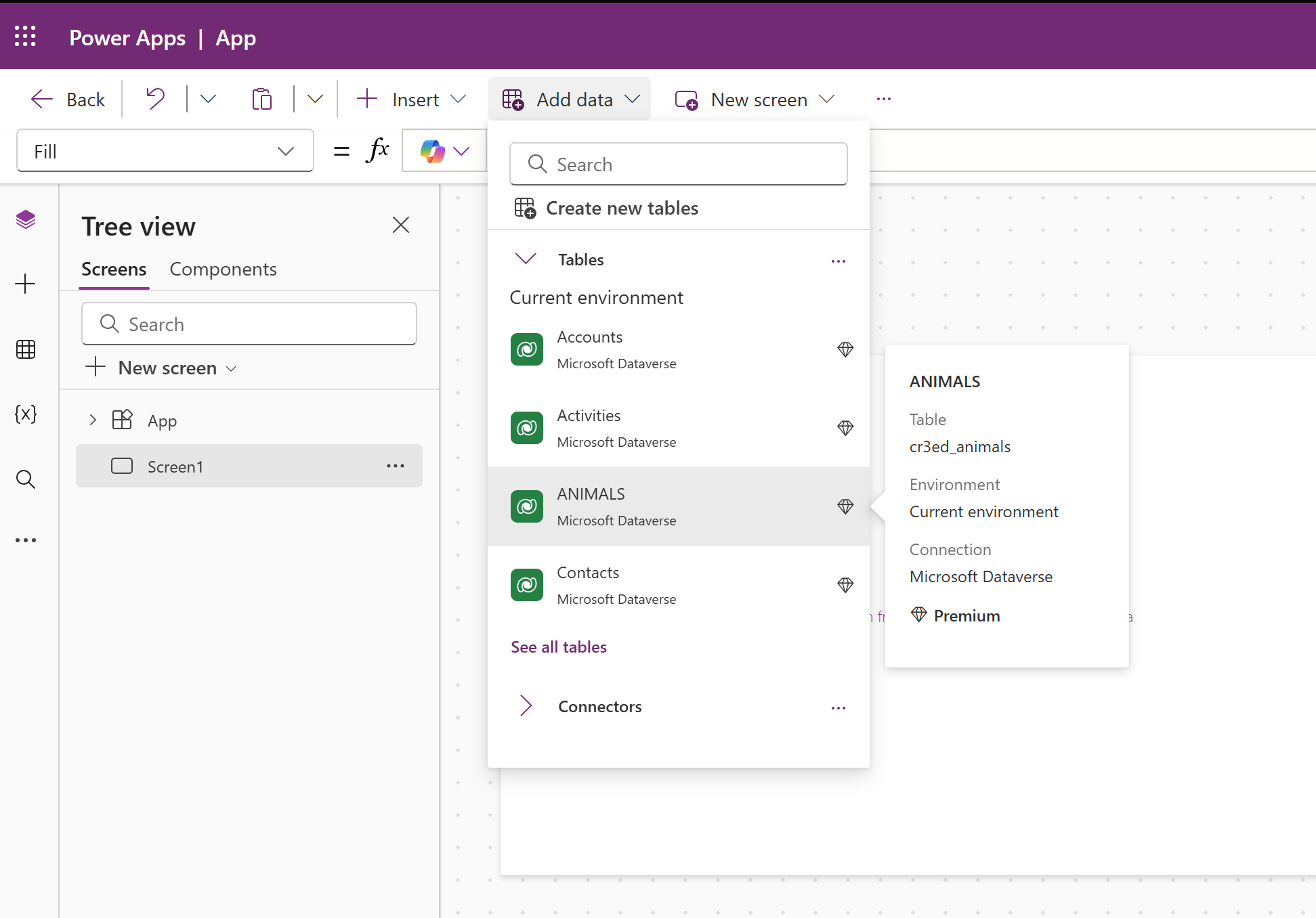 그 후에는 가상 테이블을 Canvas 앱에 로드할 수 있으며, Canvas 앱에서 빌드를 정상적으로 진행할 수 있습니다.