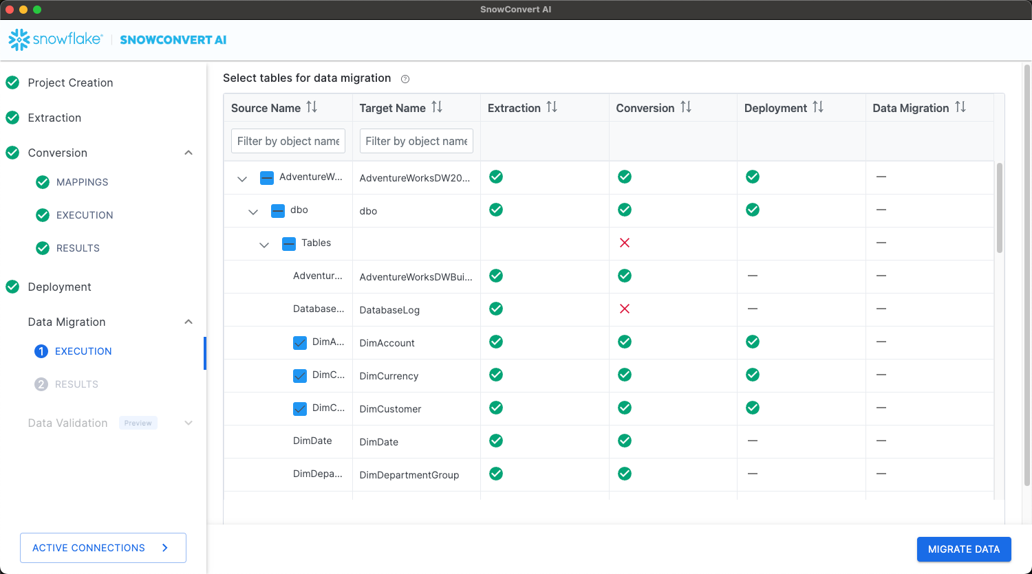 Data migration from SQL Server utilizes optimized data transfer methods to move your table data efficiently to the corresponding Snowflake tables.