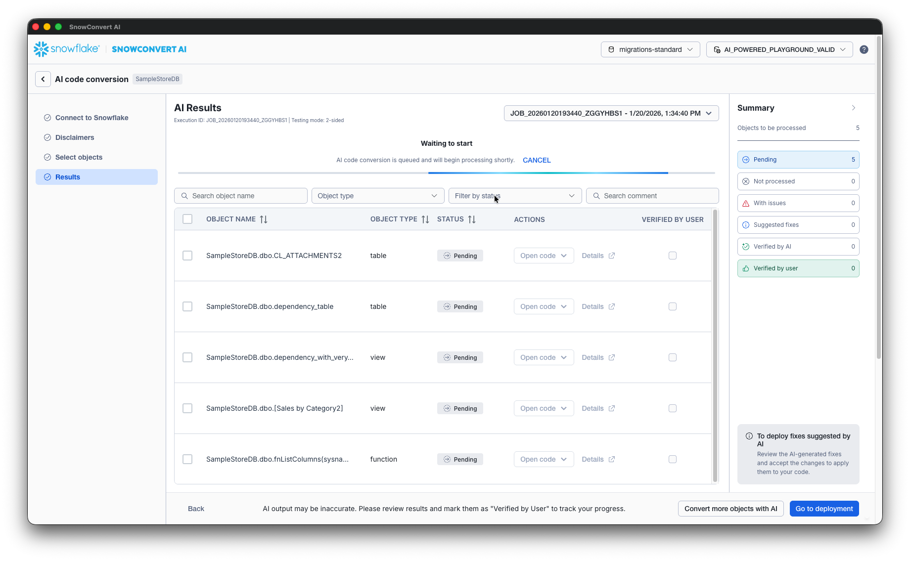The initial version is optimized for standard SQL Server migrations. While migration process can handle many query types, all the changes generated by SnowConvert AI code conversion must be reviewed by the customer before they can be deployed to any account.