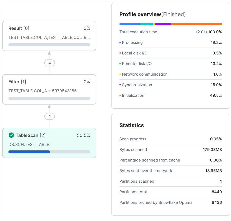 다음 이미지는 Snowflake Optima가 사용되었음을 나타내는 Statistics 창의 예를 보여줍니다.