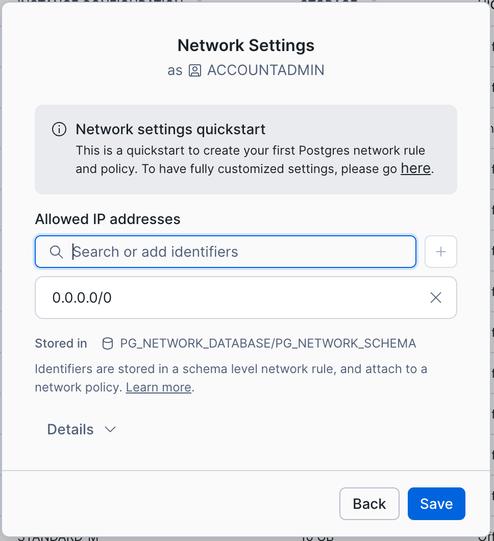 Snowflake Postgres 인스턴스를 만들기 전에 네트워크 정책과 규칙을 생성하는 대신, Snowsight를 통해 Snowflake Postgres 인스턴스를 만들 때 Postgres Ingress 규칙을 사용하여 정책을 생성할 수 있습니다.