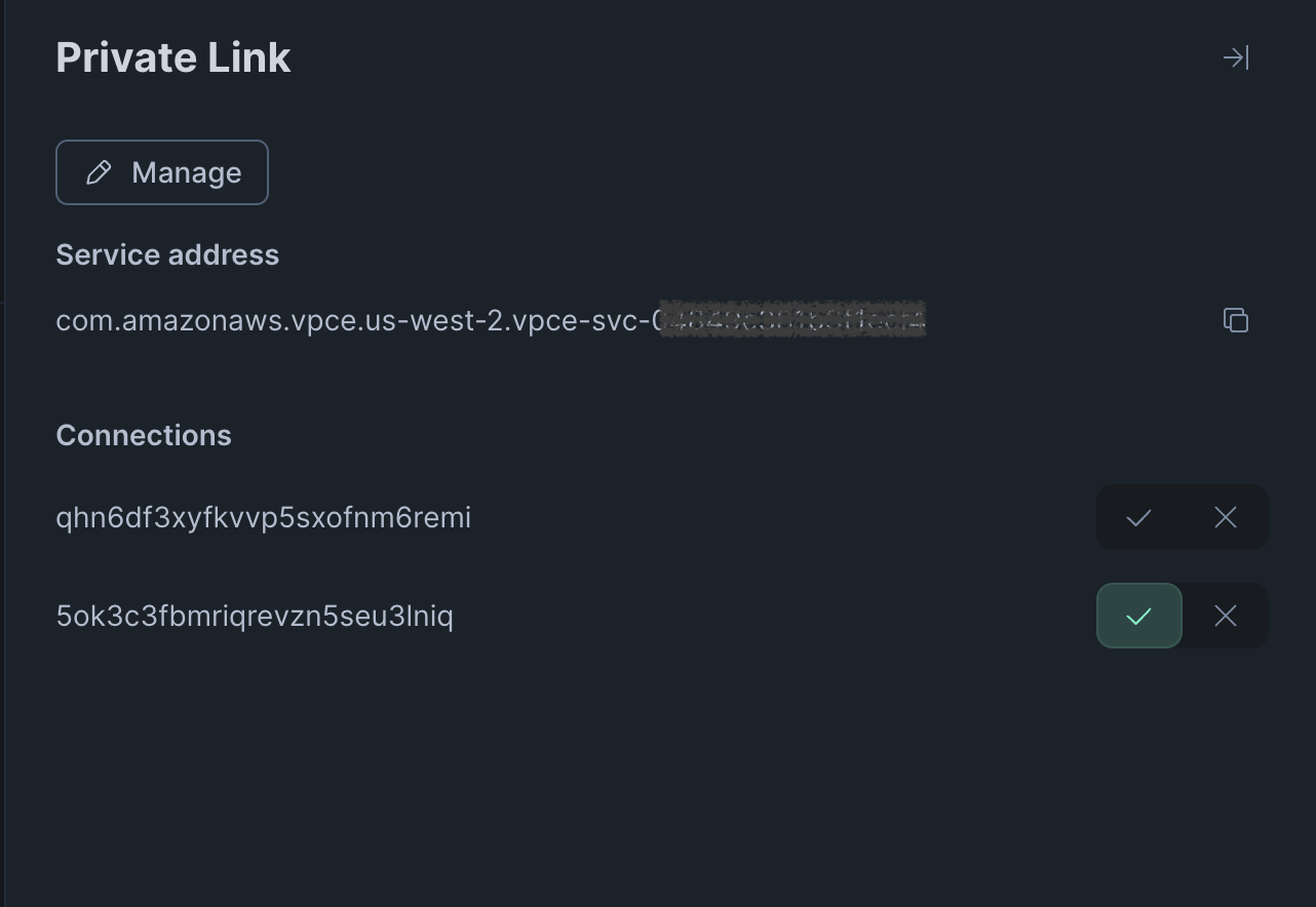 Snowflake Postgres 인스턴스의 세부 정보 페이지를 새로 고칩니다. 이제 Private Link 창에는 :ui:`check mark`(수락) 또는 :ui:`x mark`(거부)가 선택되지 않은 상태로 요청에 대한 새 연결 항목이 표시됩니다. 수락하려면 :ui:`check mark`를 선택합니다.