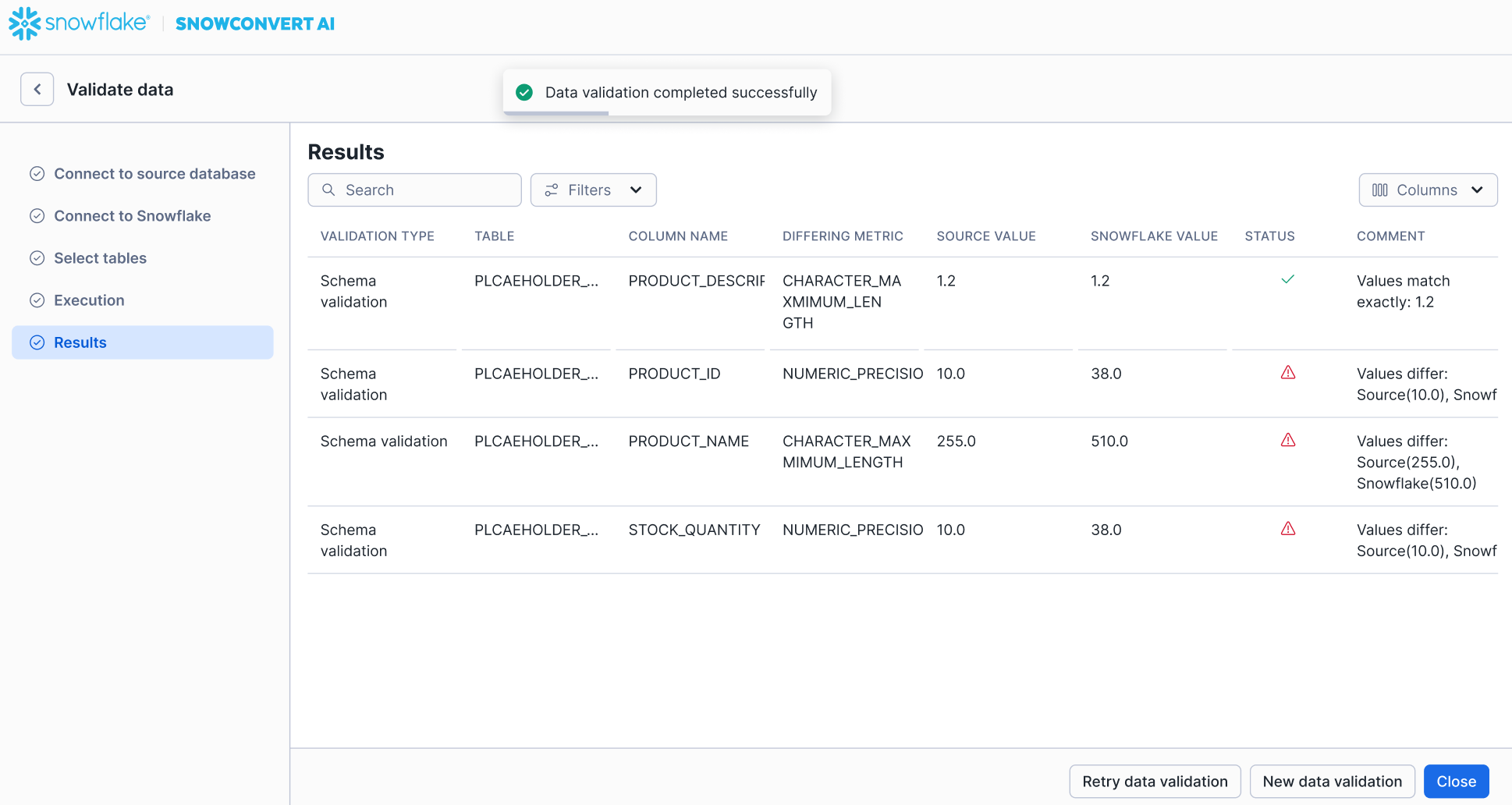 To ensure that your data is successfully migrated to Snowflake, the data validation employs two distinct validation levels: schema validation and metrics validation.