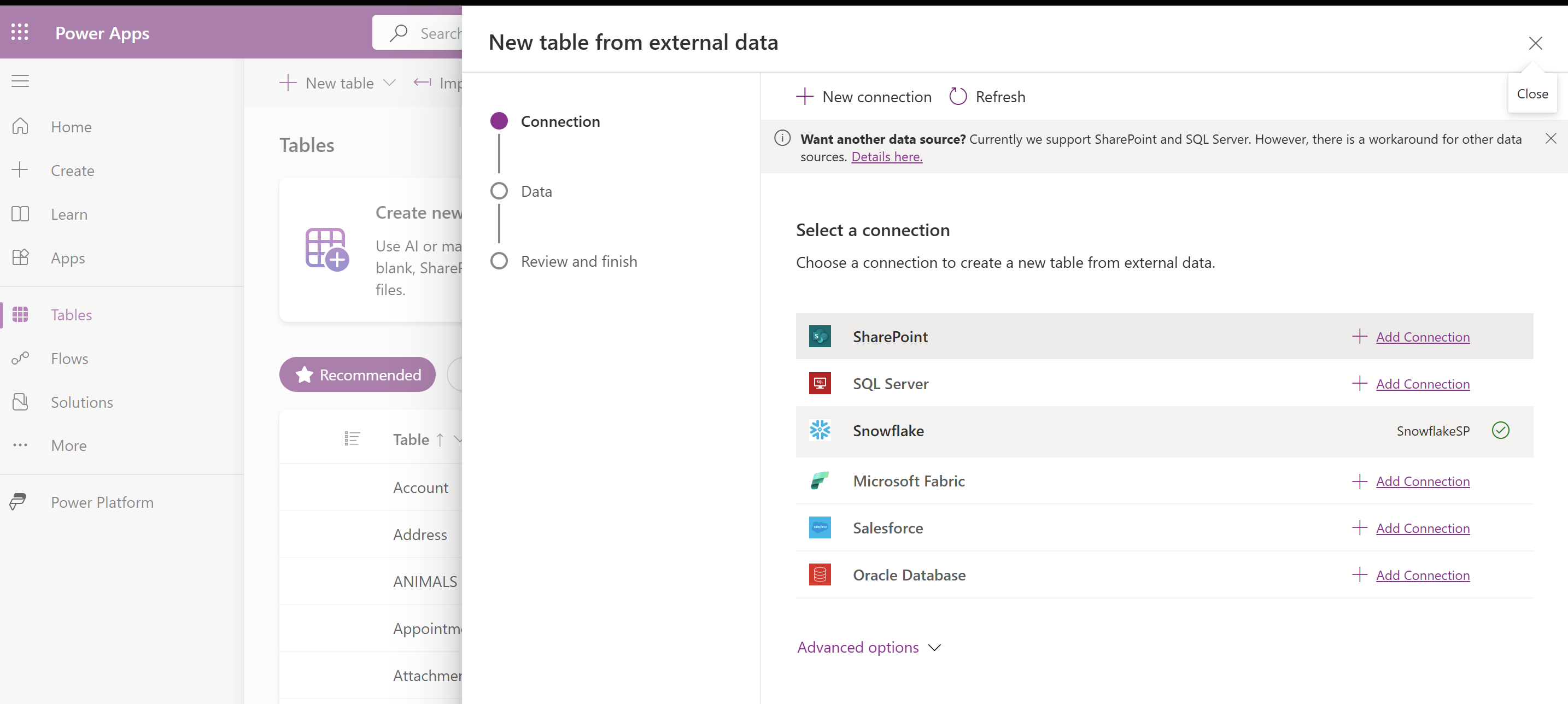 Em vez de adicionar o conector diretamente no aplicativo Canvas, crie uma conexão de entidade de serviço (não delegada) de fora desse aplicativo. Use a conexão do Snowflake criada acima e crie uma tabela virtual.