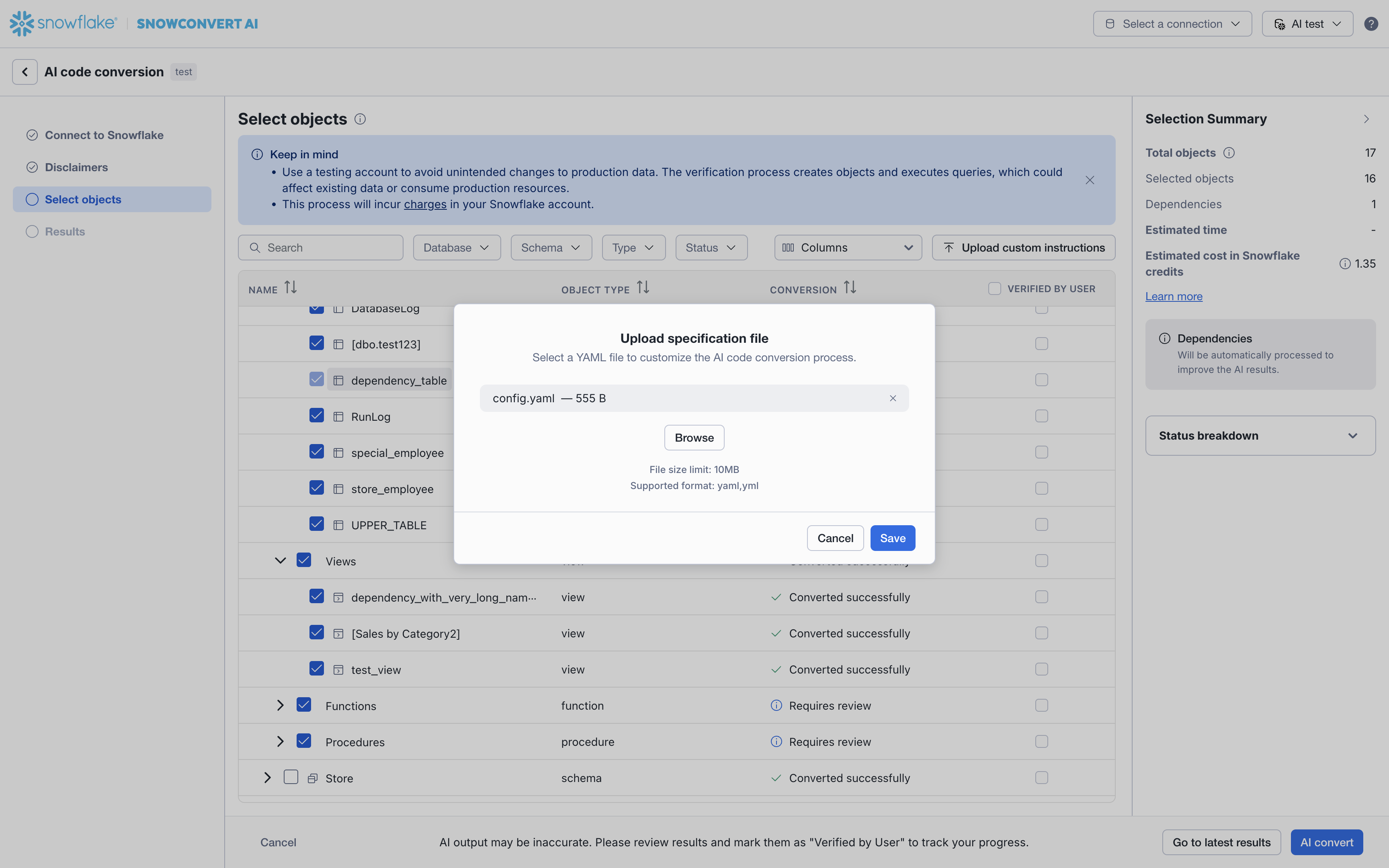 The costs for running AI code conversion with source-system verification may be different from the default AI code conversion, depending on your Snowflake credits consumption for SPCS and Cortex AI. A summary of the estimated costs and number of objects affected by the source-system verification process can be found in the Selection Summary. We recommend reviewing the Selection Summary before proceeding to AI convert.