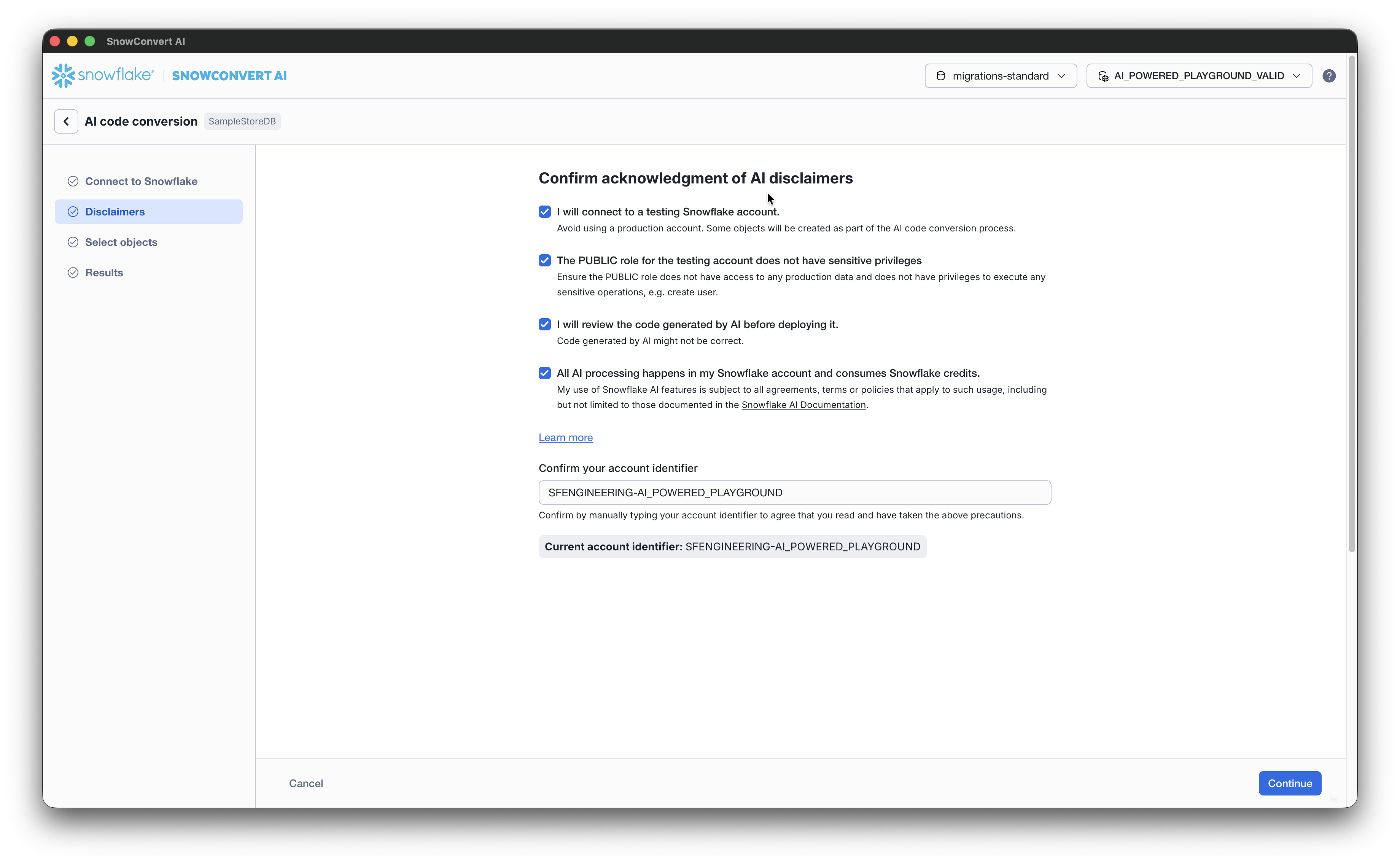 Accept the disclaimers and confirm your account identifier. Select Continue to proceed to the Select objects to verify with AI.