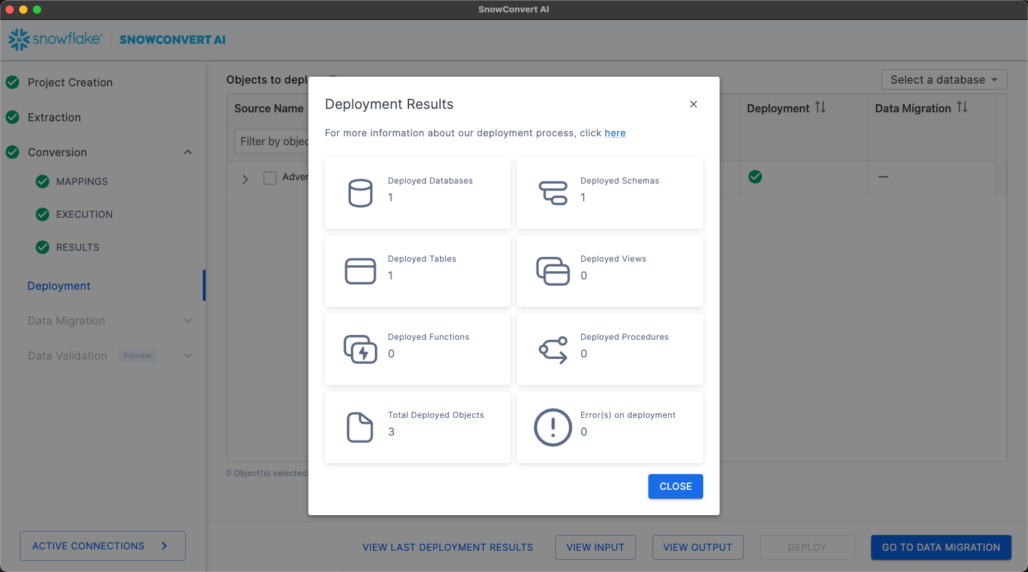 This feature allows you to deploy your converted database objects to Snowflake. After deployment, you can proceed with data migration to complete the end-to-end migration process.