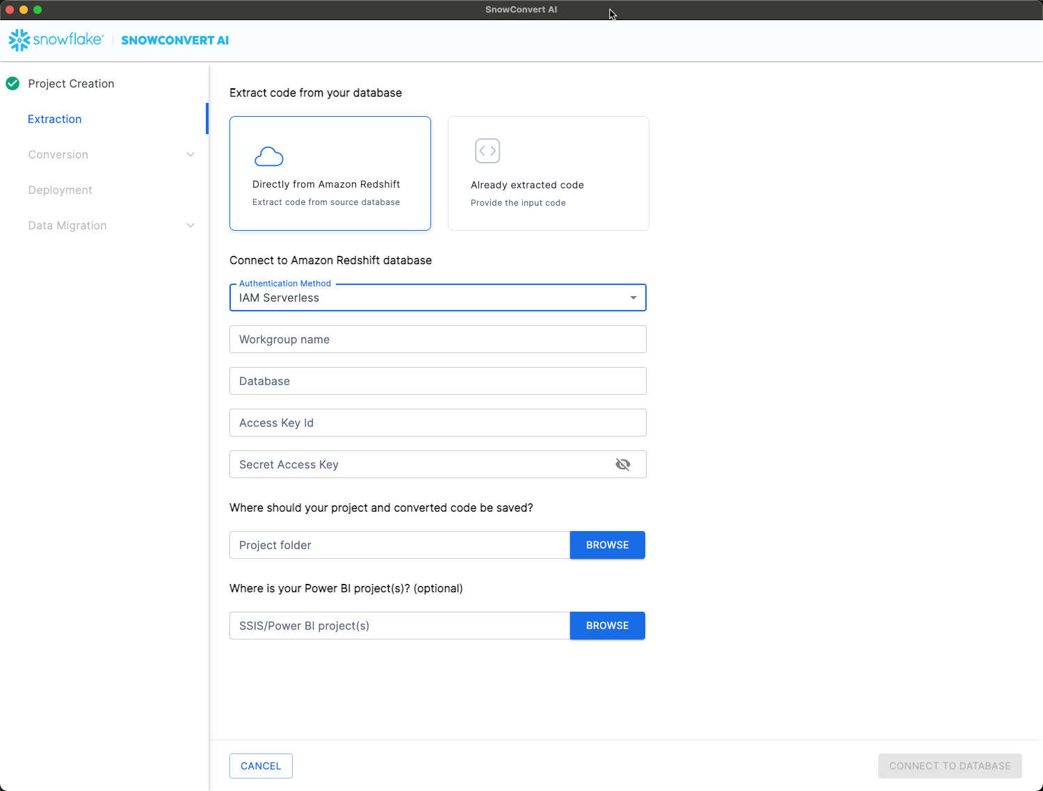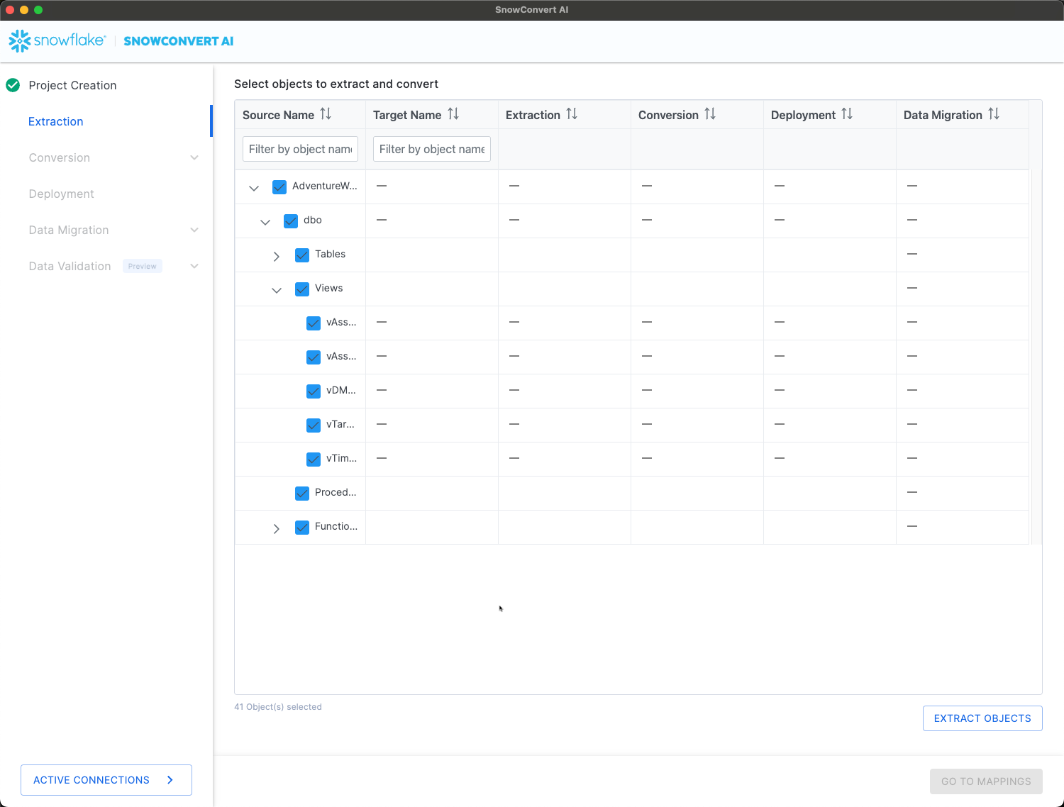 SnowConvert AI, as part of the end-to-end migration experience, offers the option to extract database objects from your source system to prepare them for the conversion process. This extraction feature is available for SQL Server and Amazon Redshift databases, allowing you to connect to your source database, browse the catalog, and select specific objects for migration.