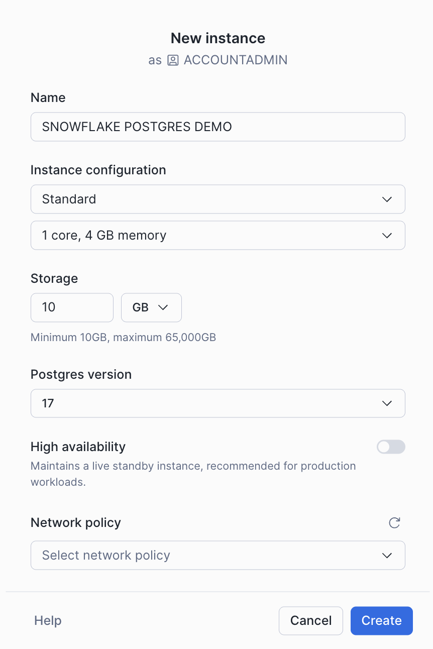Você pode criar instâncias do Snowflake Postgres usando o Snowsight ou executando instruções SQL do Snowflake. O tamanho da instância, o tamanho do armazenamento e as principais versões do Postgres são configuráveis ao criar uma instância. As políticas de redes também podem ser aplicadas às instâncias no momento da criação.