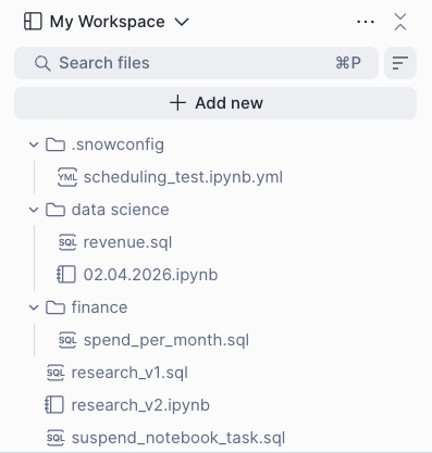 /workspace/<workspace_hash>são somente leitura e não podem ser atualizados no código durante a execução do notebook.Não é possível realizar gravações em arquivos a partir do código ou do terminal: não grave arquivos no diretório do Workspace de forma programática. Use estágios Snowflake para arquivos persistentes (consulte Arquivos persistentes).